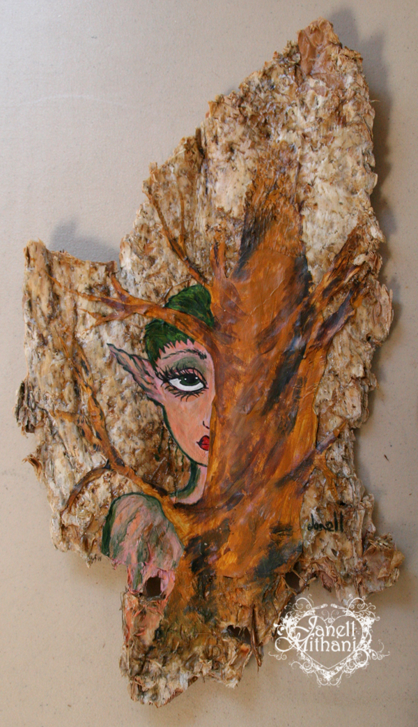 I love painting tree fairies and I have been experimenting with painting them on the bark of the Australian paper bark, Melaleuca quinquenervia trees.  We have a lot of them here in Southern California.  I love the organic shapes and the textures and feel painting on a natural piece of bark fits with my art.  The paper-like bark peels right off of the trees and it doesn’t hurt the tree to harvest the bark.