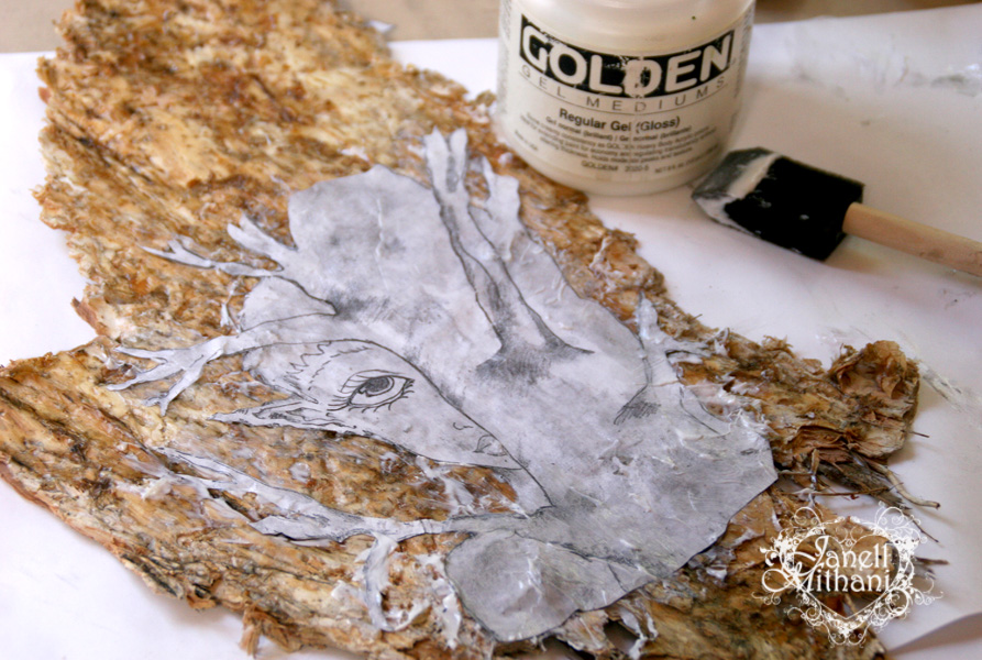 I posted the sketch of my tree fairy a few weeks ago.  The tree bark can be really smooth on the back side, but I really liked the front side of this piece of bark.  Since it had a lot of texture, I decided to re-create my sketch to size, cut it out, and glue it to the bark as a beginning for the painting.  I also applied a coat of gel to seal and smooth out the bark.