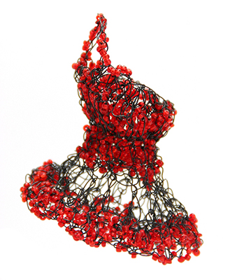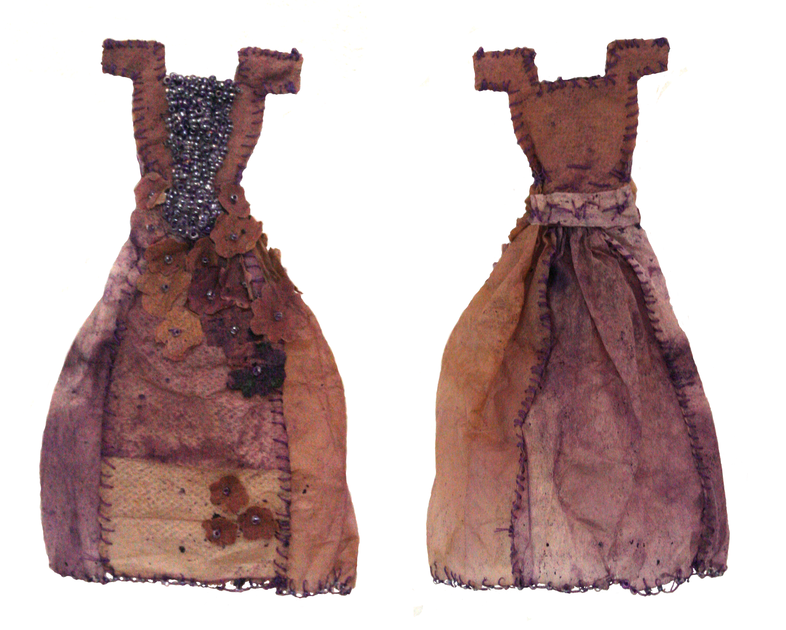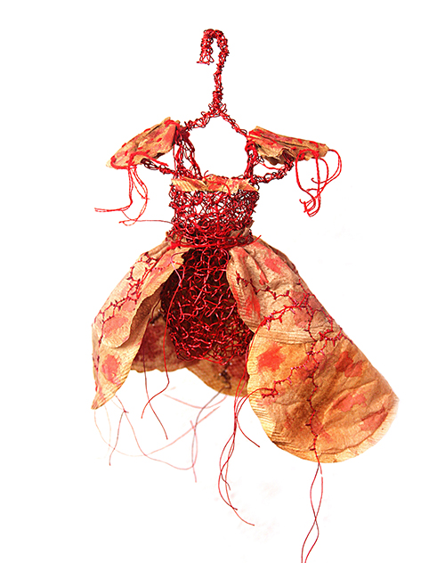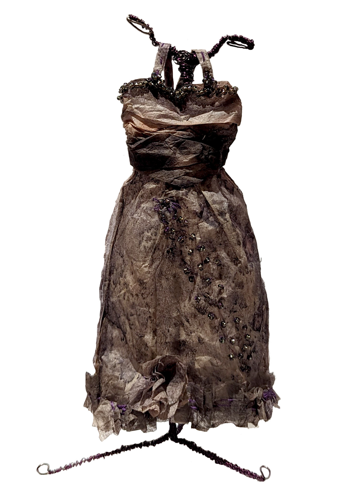 Years ago, my Pakistani mother-in-law introduced me to the daily tea ritual, which me and my family adopted. After my mother passed away five years ago, I started creating paintings on tea bags which progressed into small visual, sculptural relief pieces which are an exciting development after working two dimensionally throughout my career. Although I paint many subjects, I was drawn to the iconic dress, which also celebrates the hours my grandmother, mom, and aunts spent “tending” with their hands. My current body of work, “Dresses, Reflections of Past and Present,” focuses on exploring visual storytelling, reflecting my complex thoughts on gender equality, women’s roles, past and present; and how women’s health and rights are evolving throughout my lifespan. The pieces have become more complex, slow to take form: emptying tea bags, adding paint and natural plant dyes, slow stitching, forming shapes with wire, and feeding my garden with the used tea leaves.