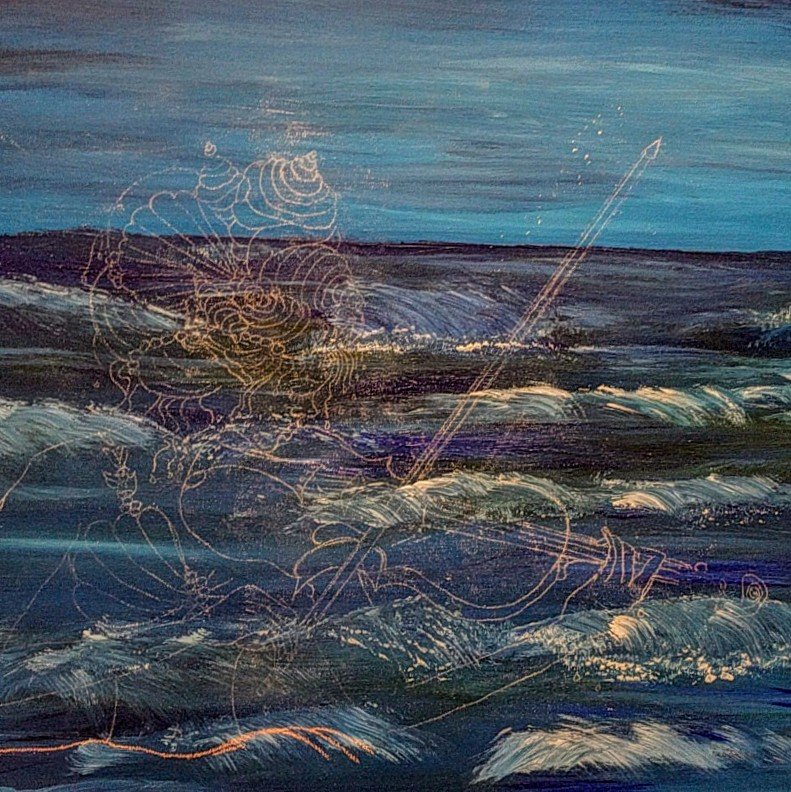 I add pastel chalk to the back of my sketches to transfer the drawing into my painting once I have the background painted.I transferred the sketch with light pink and white pastel chalk so I could see it on the dark ocean.The beginning of blocking in the shapes of the mermaid.I had fun with the sea shells in her hair. 😁