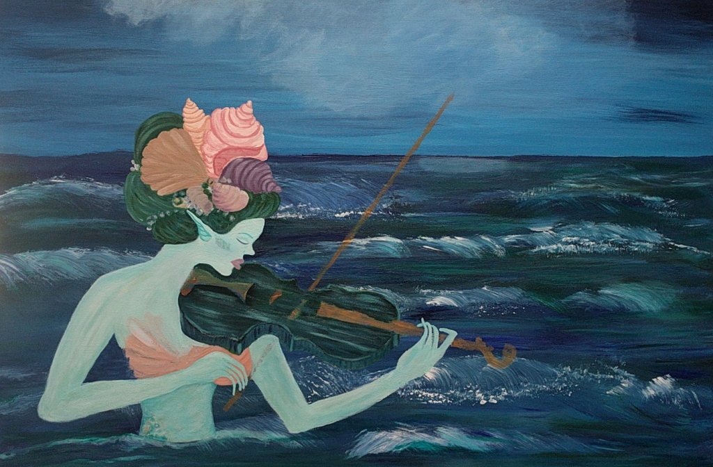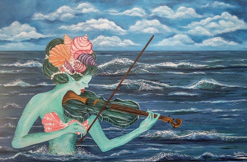 This is one of my large scale paintings and it took me about three months to complete it. It is the first painting in my new series, “Musical Mermaids.”