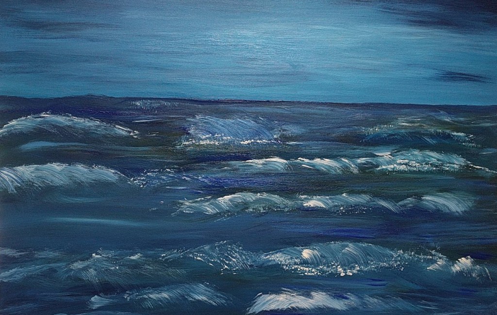 I worked on the sky and ocean more and changed up the waves.I have to admit I’m loving turquoise skin! I paint the title on the sides of my large paintings that are on gallery wrapped canvas. My daughter (my word girl) helped me with the title. I use one word titles most of the time.A last look at the finished piece.